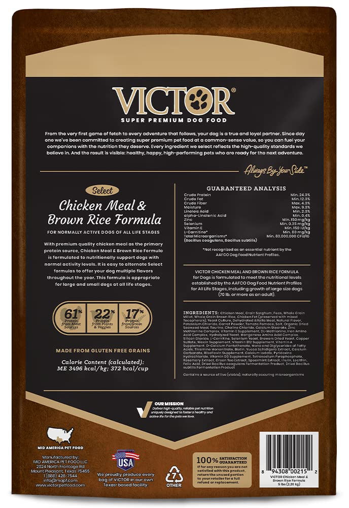 - CHICKEN MEAL & BROWN RICE: VICTOR Chicken Meal & Brown Rice Formula super premium dog food is formulated for normally active dogs and is ideal for dogs with allergies to other proteins; packed with 24% protein and 12% fat, this dry dog food promotes optimal nutrition for energy and growth for your furry friend