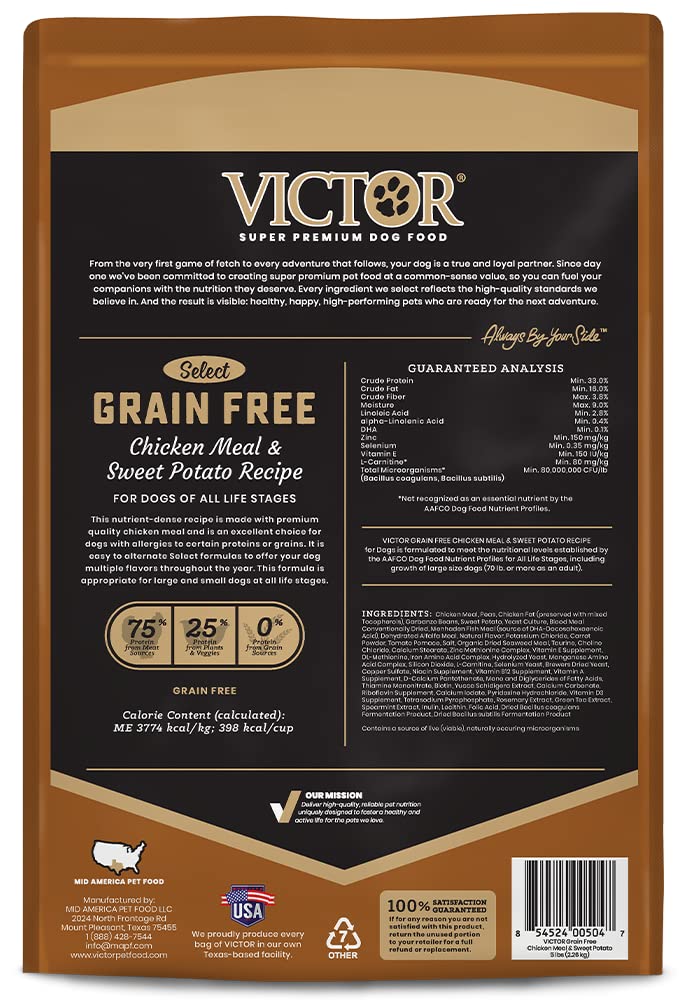- CHICKEN MEAL & SWEET POTATO: VICTOR Grain Free Chicken Meal & Sweet Potato super premium dog food is formulated for normally active dogs and is an ideal high protein kibble for dogs with allergies to other meat proteins.