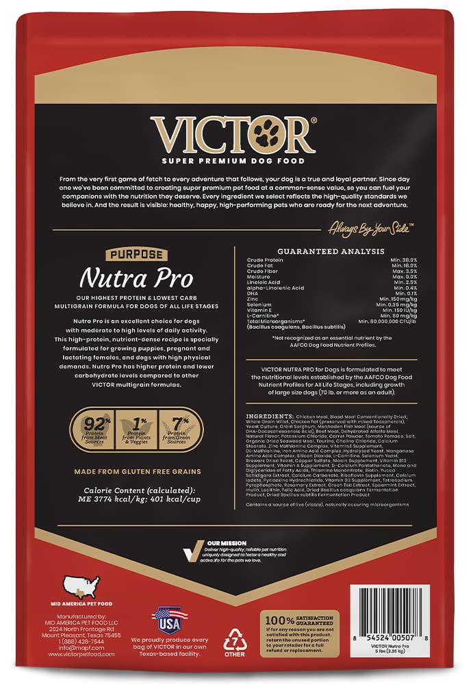 - ACTIVE DOG FOOD: VICTOR Purpose Nutra Pro is a gluten free, high protein dog food with a nutrient-dense, multi-meat formula; this dry dog food’s ingredients help provide sustained energy and immune support for sporting dogs