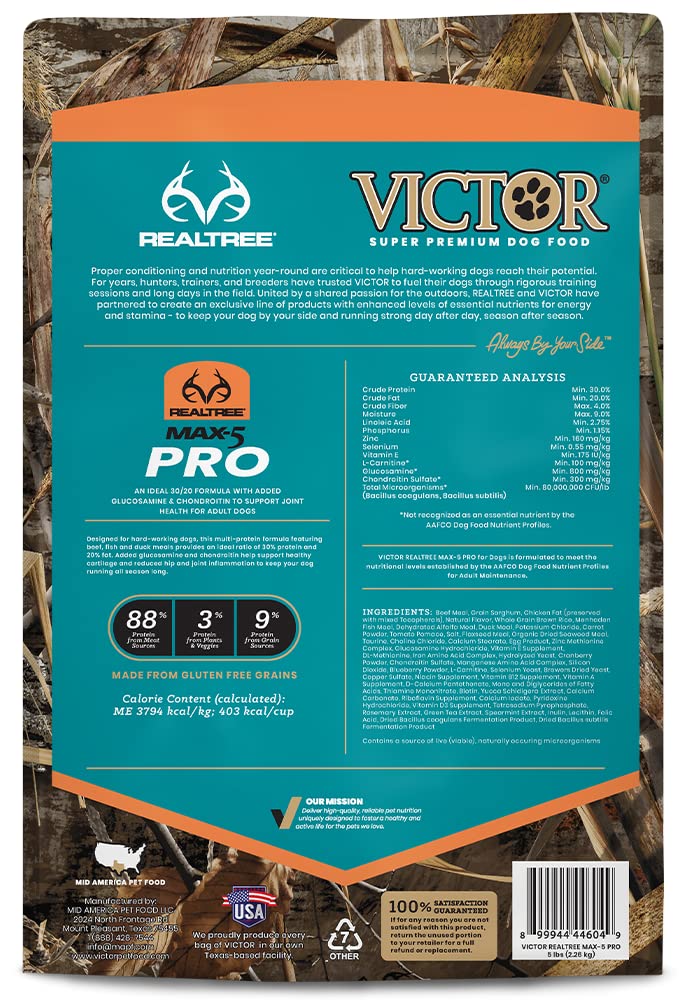 VICTOR Super Premium Dog Food – Realtree MAX-5 PRO High Protein Dry Kibble – Promotes Joint Health with Glucosamine – 30% Protein, Gluten Free for Active & Sporting Adult Dogs, 5lb—